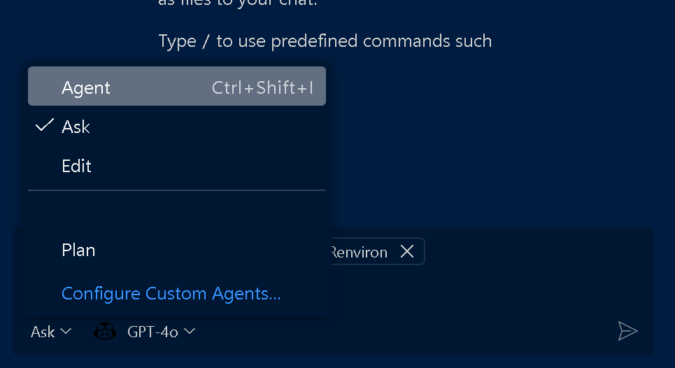 In the menu on Positron Assistant Chat, click on “Ask” and then on “Configure Custom Agent” to create a global agent: